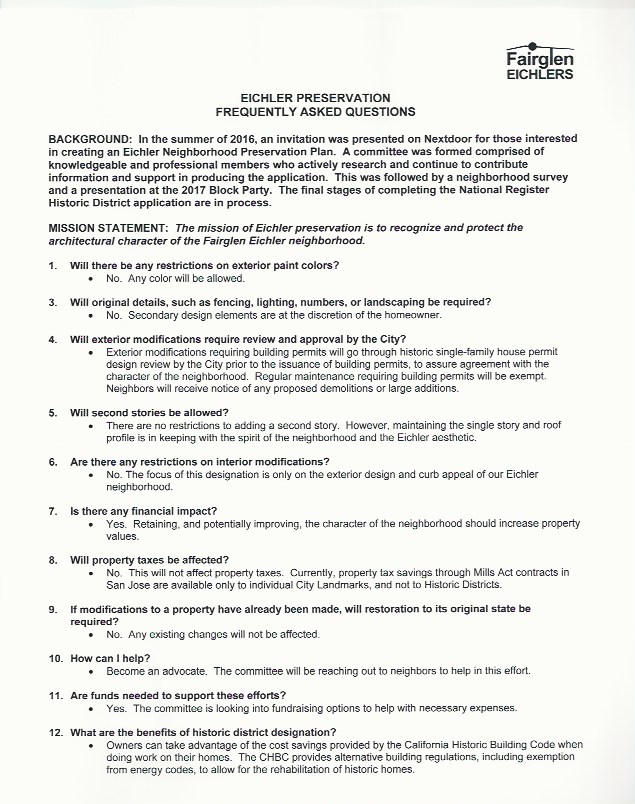 Adopted in 2018, "The Palo Alto Eichler Neighborhood Design Guidelines were prepared for the City of alo Alto to serve as a voluntary project planning tool for homeowners, architects, and City staff. The document addresses values expressed by the local community and provides advice and direction for undertaking work in ways that retain the architectural character of these memorable neighborhoods." Palo Alto Eichler Neighborhood Design guidelies